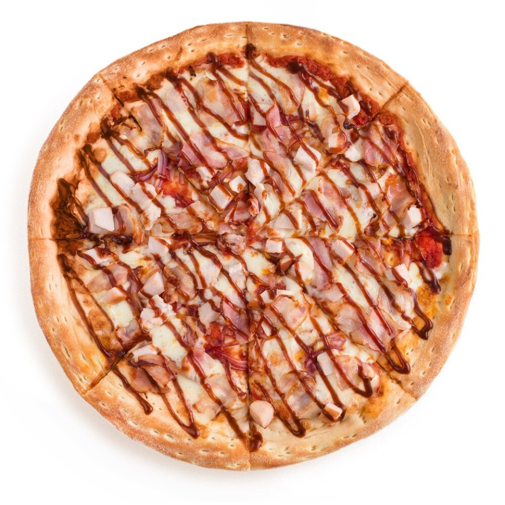Томатный соус, сыр «Моцарелла», бекон, красный лук, филе цыплёнка, соус «Барбекю»
