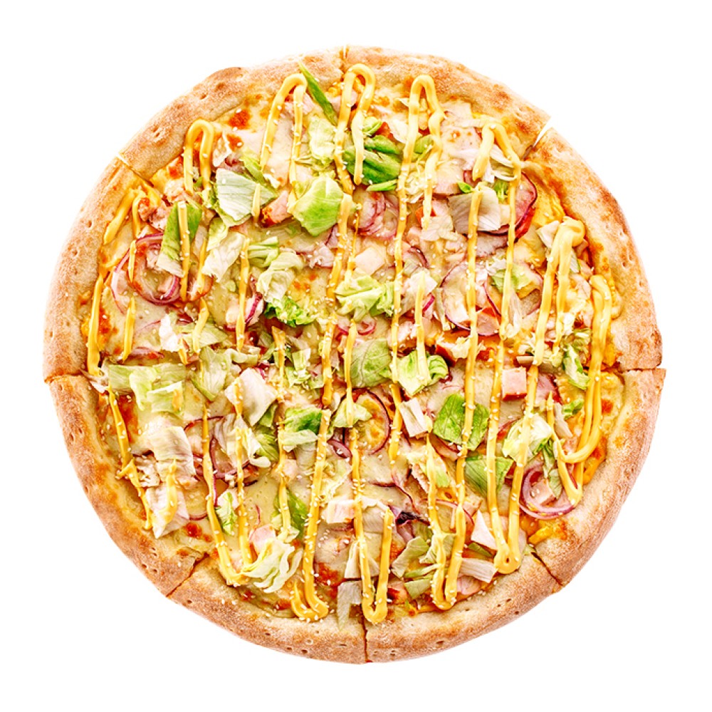Сыр «Моцарелла», лук красный, филе цыплёнка, соус сырный, ветчина, листья салата «Айсберг», кунжут