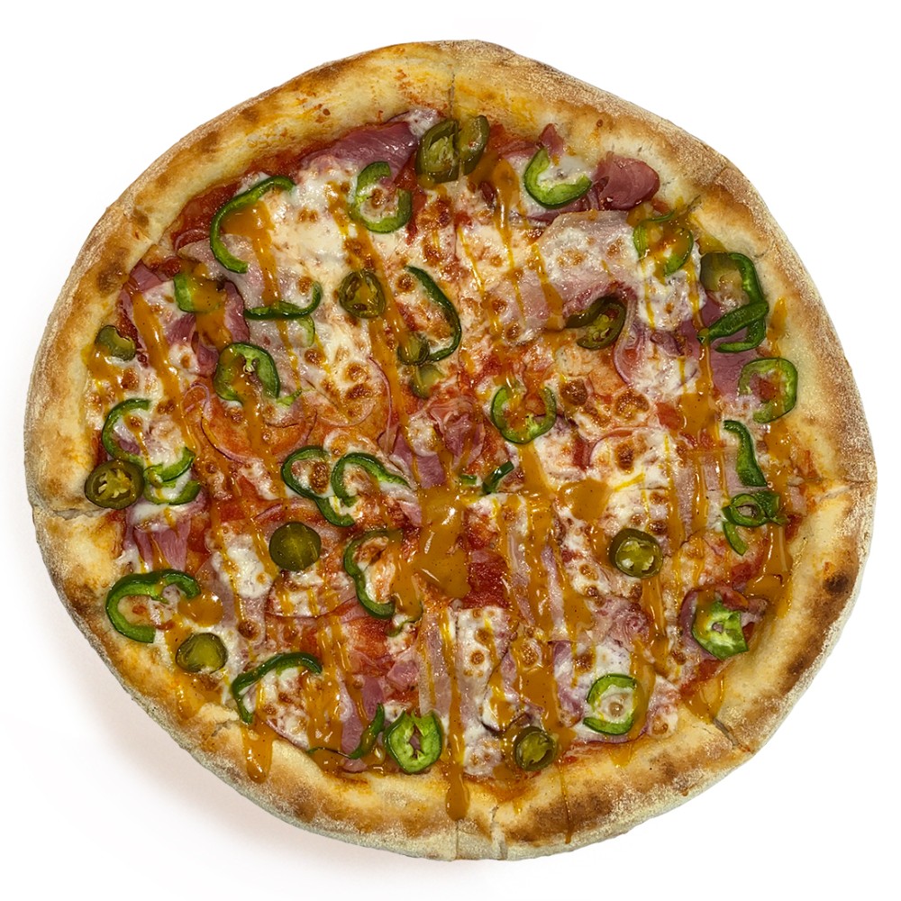 Томатный соус, бекон, ветчина, перец болгарский, халапеньо, лук, сыр «Моцарелла», соус «Карри».