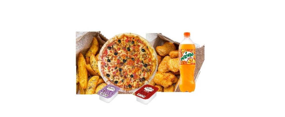 Пицца "Плэнет " 30см, Наггетсы 100 г Картофельные дольки с орегано200 г Напиток газированный "Меринда" 0,5л., Соус Терияки Соус Барбекю