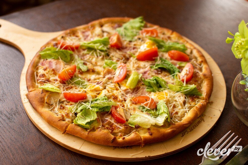Тесто для пиццы,соус цезарь,моцарелла,филе цыпленка,бекон,яйцо перепелиное,салатный лист,черри,пармезан,специи