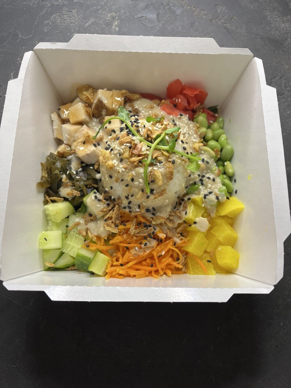 Рис,заправка кунжутная,авокадо,филе цыпленка ,огурец свежий, чука,салат,кунжут,нори,бобы эдамаме,ананас консервированный