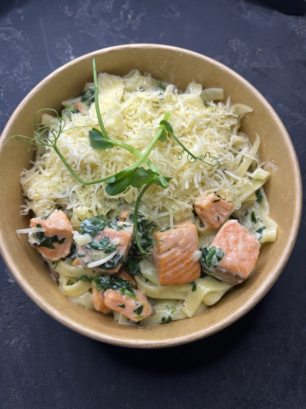 Спагетти,лосось с/с,шпинат,сливки,сыр Пармезан