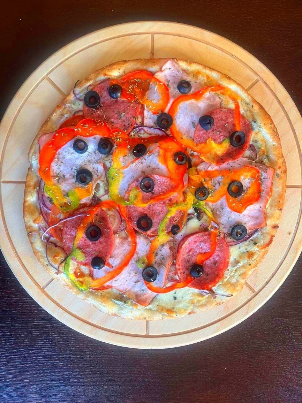 Тесто для пиццы,соус фирменный,сыр Мацарелла ,салями к/в,перец свежий,томаты,лук красный,маслины,базилик сухой к,специи,масло ароматное