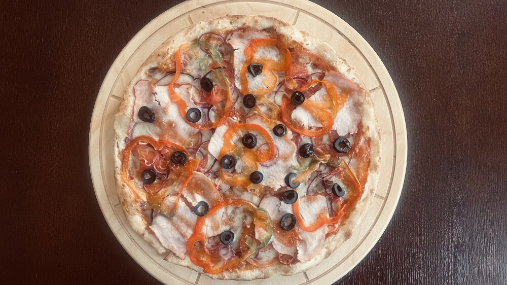 Тесто для пиццы,соус томатный основной,сыр Мацарелла ,карбонат, томаты,лук красный,перц свежий,маслины, специи масло ароматное