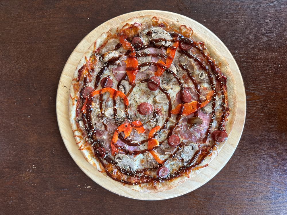 Тесто для пиццысоус томатный основной ,соус барбекю, моцарелла,ветчина в/к, шампиньоны,рваная свинина,копченые колбаски,сладкий перец специи