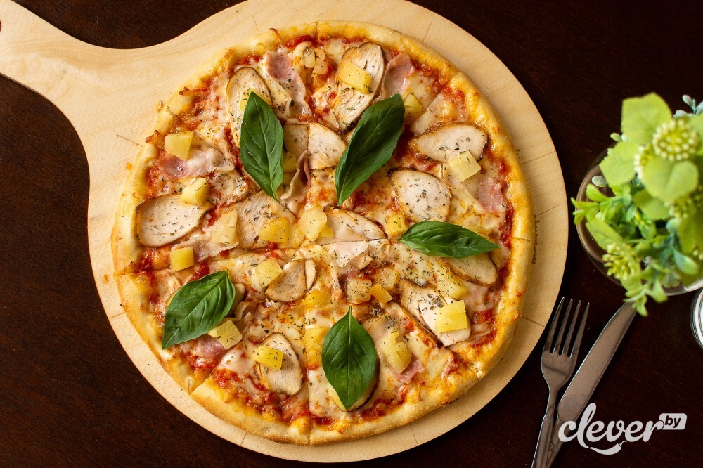 Тесто для пиццы,соус сливочный,сыр моцарелла,филе цыпленка,ананас консервированный,бекон,специи