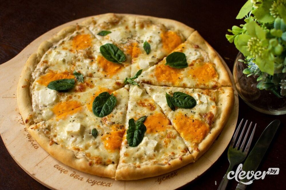 Тесто для пиццы,сливочный соус,сыр моцарелла, фета, чеддер ,кремчиз,пармезан ,специи