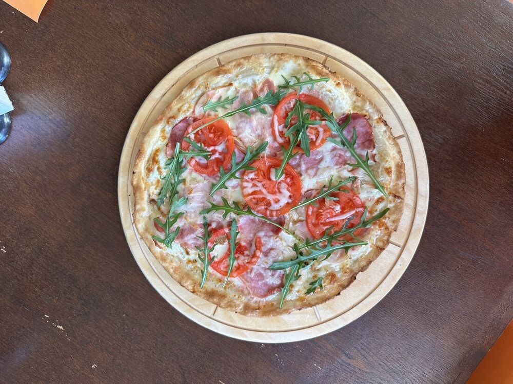 Тесто для пиццы, соус пелати,сыр моцарелла,ветчина с/в,томаты,руккола,специи