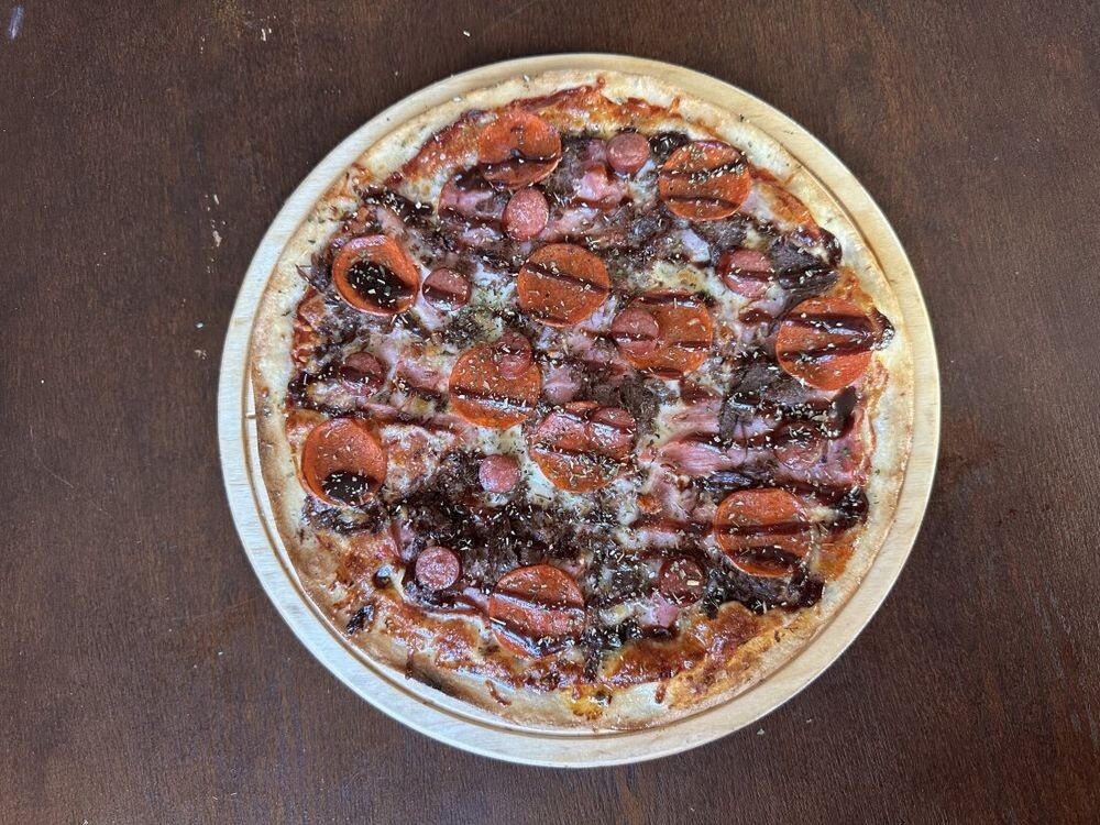 Тесто для пиццы ,соус томатный основной , соус барбекю,сыр «Моцарелла», колбаски «Охотничьи»,пепперони,ветчина,рваная говядина