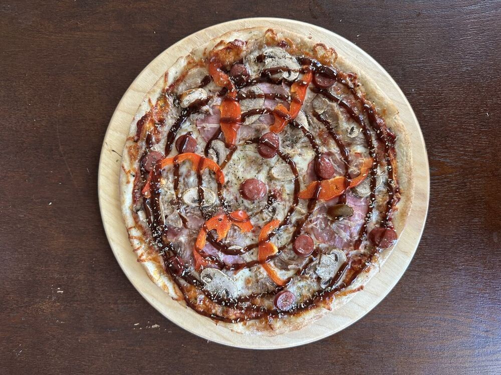 есто для пиццысоус томатный основной ,соус барбекю, моцарелла,ветчина в/к, шампиньоны,рваная говядина,копченые колбаски,сладкий перец специи